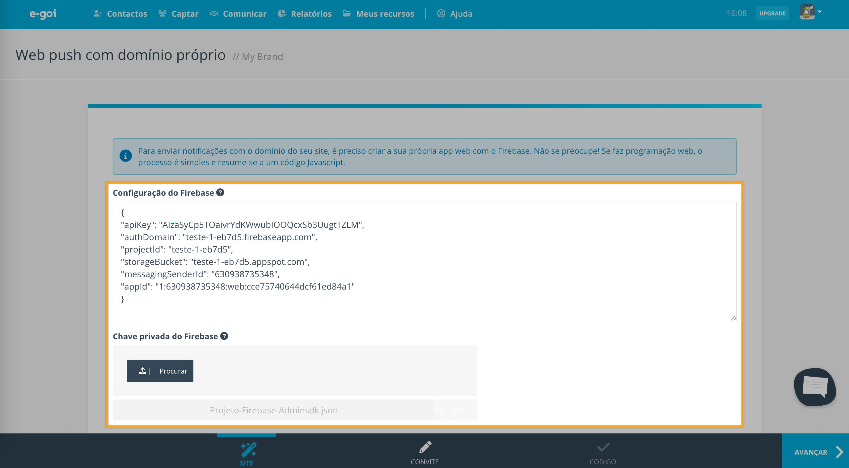 - Tu app web push en E-goi necesitará tener dominio própio configurada con Firebase.