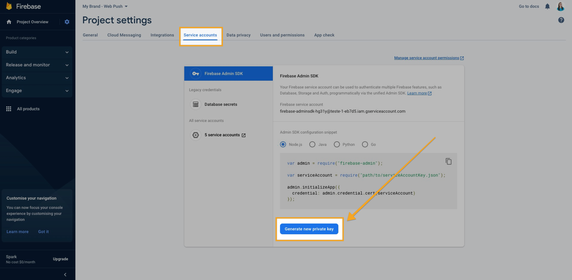 7) Scroll up the project settings page and click the Service accounts tab. Then hit Generate new private key. This will pull up a keyfile which you'll need to add to E-goi in the next step.