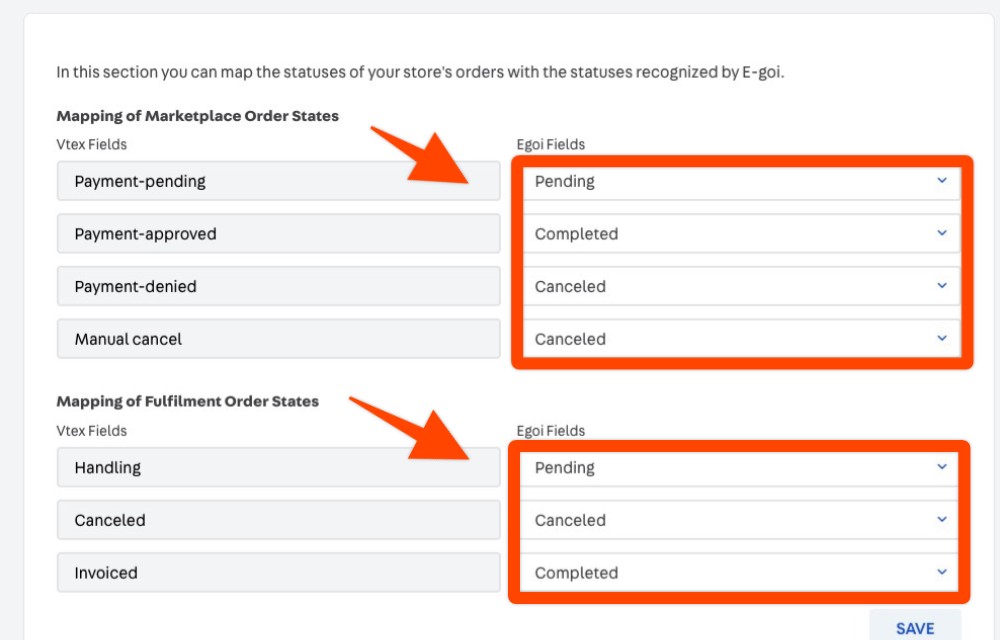 2) Escolha os estados de pedido do E-goi aos quais vão corresponder os estados dos pedidos do VTEX (quer dos pedidos Marketplace quer dos pedidos Fulfillment). Quando terminar, clique em Save.