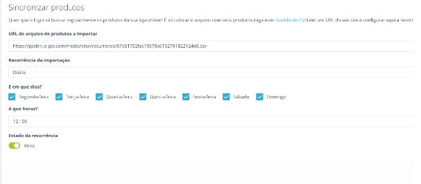 2) Quando tiver o URL do arquivo XML, acesse o Goidini e na área Sincronização de produtos, clique em Configurar.