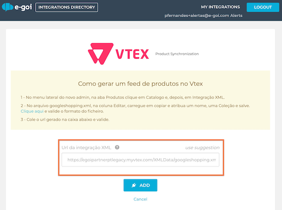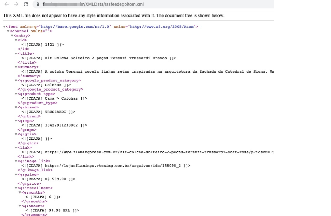 A VTEX coloca o URL como lojaxpto.myvtex.com/XMLData/rssfeedegoitom.xml mas "lojaxpto.myvtex.com" deve ser o domínio completo da loja (ex. www.lojaxpto.com.br/XMLData/rssfeedegoitom.xml ) .
