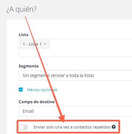 1) En el paso Preparar de la campaña (donde eliges las opciones de envío), ve al área ¿Para quién?, abre Opciones avanzadas (o Más opciones) y activa la opción Enviar solo una vez a contactos repetidos.