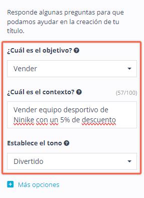 - Objetivo: Elige el objetivo del texto (ej. vender, informar, hacer upsell, etc.).