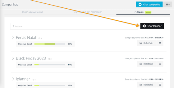 À direita de cada Planner está o botão Relatórios. Clique nele para ver as suas métricas globais ou por campanha.