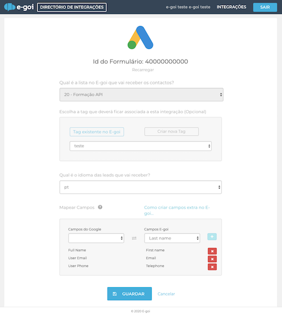 8) Volte à página da integração no Goidini e escolha em que lista do E-goi os contatos do Goole Lead Forms vão entrar, a tag que pode associar opcionalmente a esses contatos para segmentá-los, o idioma deles e os campos de informação que é preciso sincronizar.