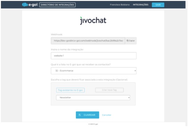 2) Provide a name for the integration, choose the E-goi contact list thet JivoChat contacts will be funneled into and, if necessary, assign them a tag.
