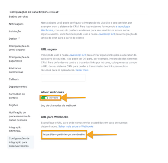 5) Go to Integration settings for developers, enable the webhook and paste the code you copied.
