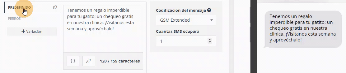 2) Edita el SMS y pulsa en el botón Variación al lado del contenido del mensaje.
