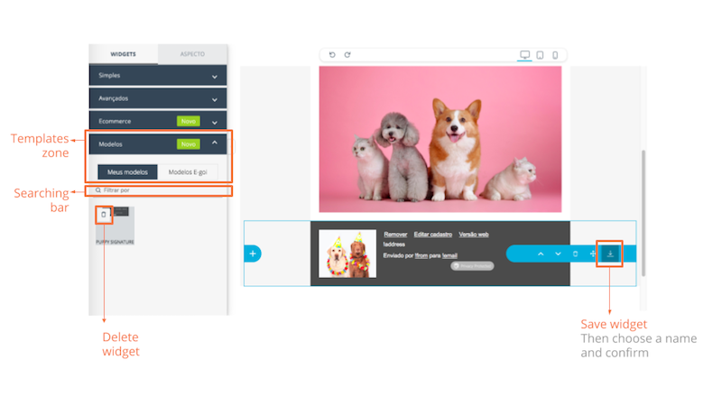 To facilitate the design of your email, Email Builder has various content elements (which we call "widgets") that you can directly insert into the email. Just drag a widget and drop it where you want.