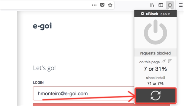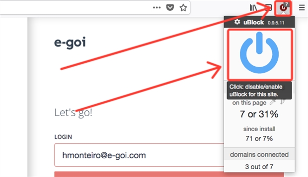 6) Sometimes, adblocking and anti-virus software (especially uBlock and some Kaspersky versions) may get a little cranky and prevent you from logging into E-goi.If you use uBlock, simply head over to your E-goi account's login, bring up uBlock and hit the large on/off button to turn it off across that page (do the same in our website). Refresh the page and you should now be able to login: