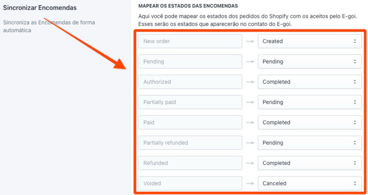 2) Under Orders Synchronization, map the E-goi order statuses to your Shopify order statuses.
