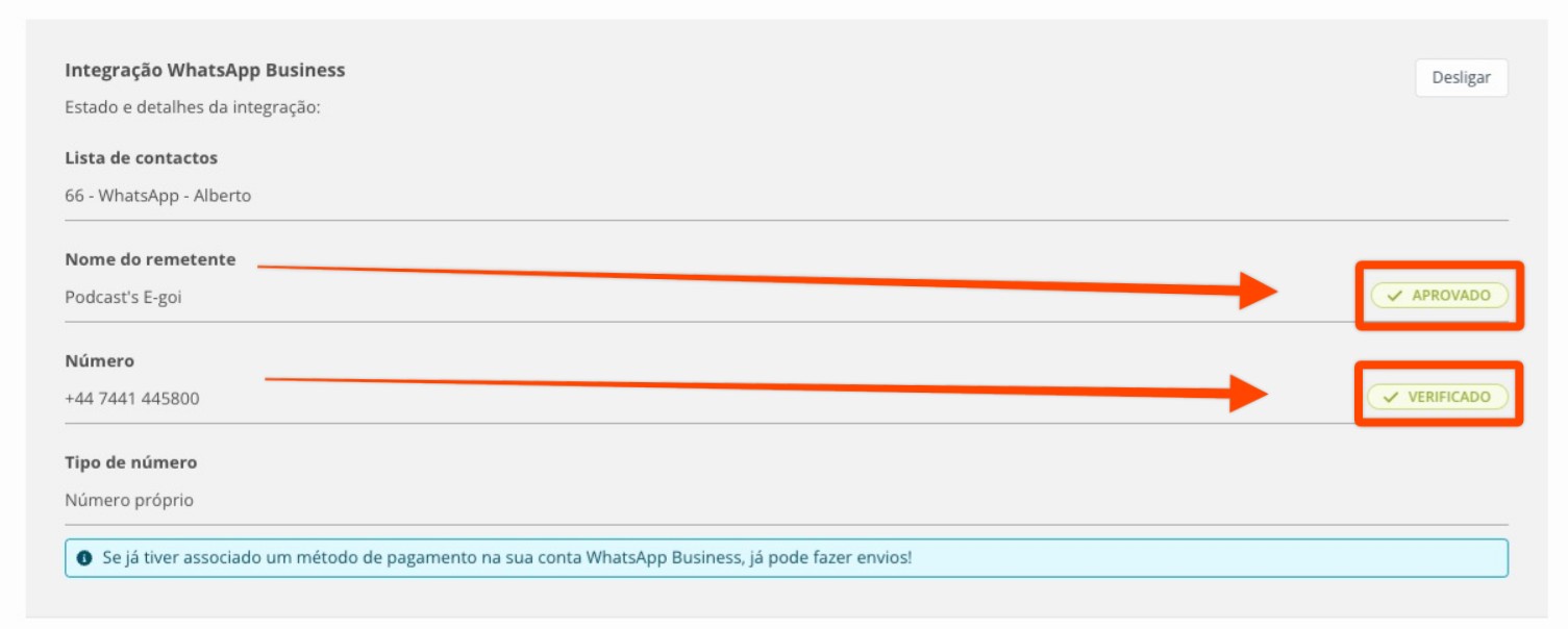 8) Wait for Meta to approve your mobile number and company info. Once approved, your WhatsApp Business integration status in E-goi will display Approved and Verified for your company name and mobile number.