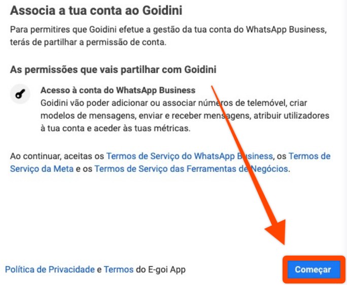 4) Authorise Goidini (E-goi’s integration manager) to access your WhatsApp Business account by hitting Start.