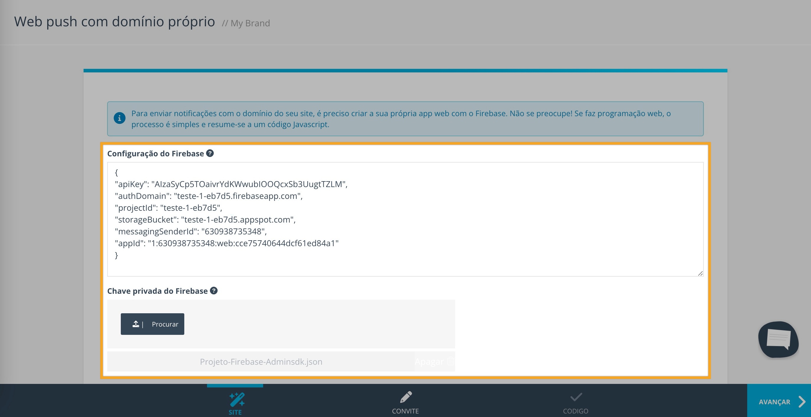 13) Avance para a criação do convite web push normalmente. No passo de colocação do código do convite no site, tenha em conta estes pontos: