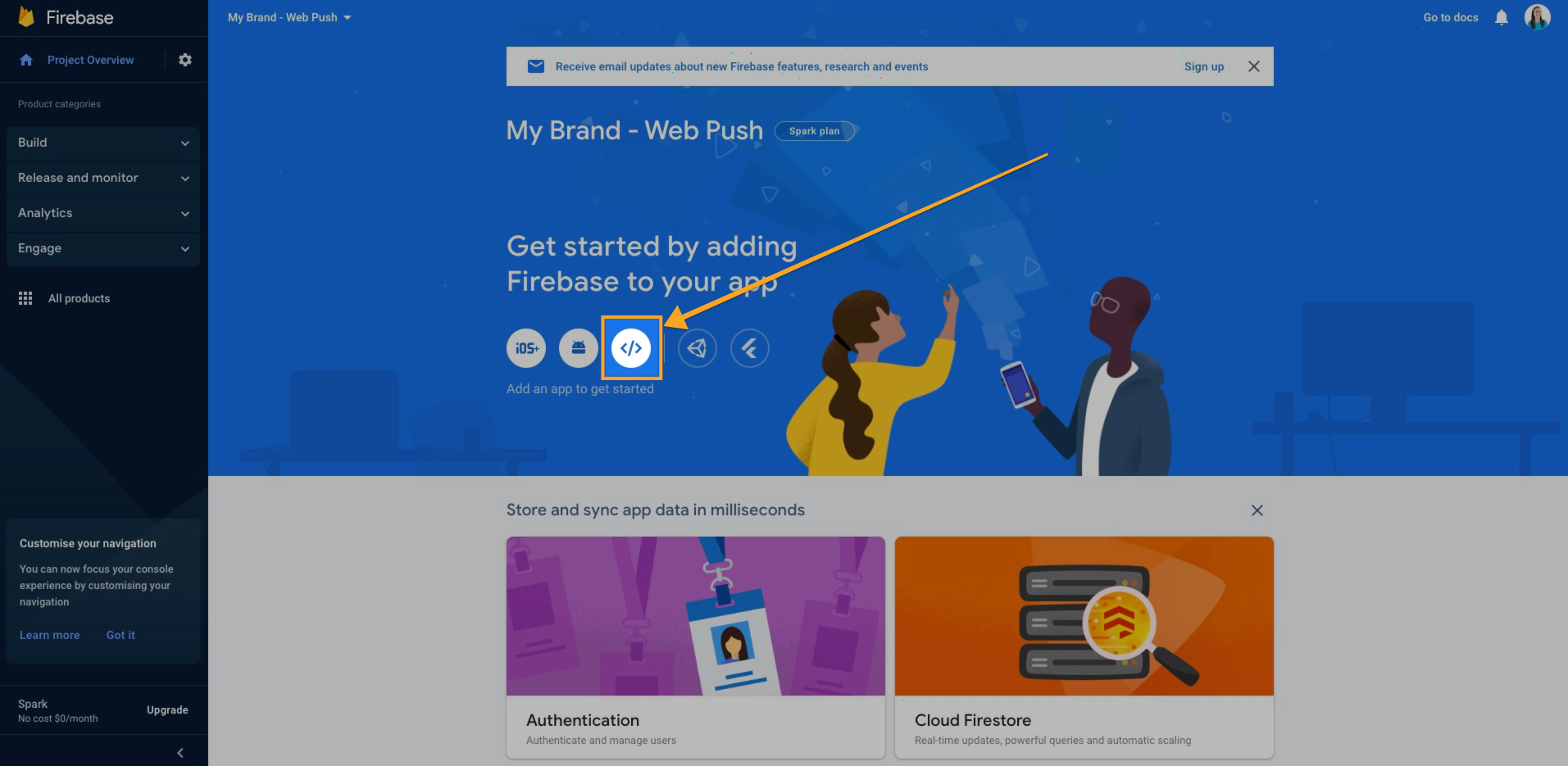 Trata-se de aceder ao Firebase, uma funcionalidade da Google, para criar a app web com o domínio do seu site. Através dela, vai obter um código JSON e um documento da chave privada que deverá colocar depois ao adicionar a app web no E-goi.