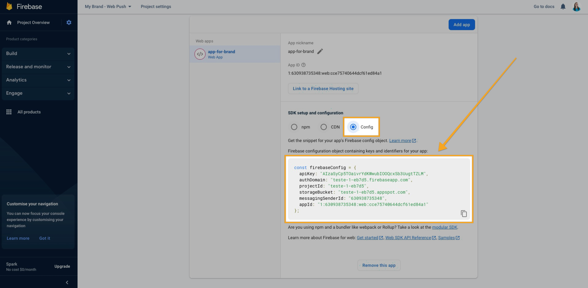 6) Vá ao fundo da página para visualizar a app web criada. Ao chegar à área do SDK setup and configuration clique em Config. Vai precisar de copiar e colar esse código no E-goi no passo 2 deste artigo.