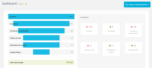 O dashboard pode ser inteiramente personalizado com blocos de informação (a que chamamos "widgets") para que possa ver rapidamente os resultados e tendências mais relevantes da sua estratégia.