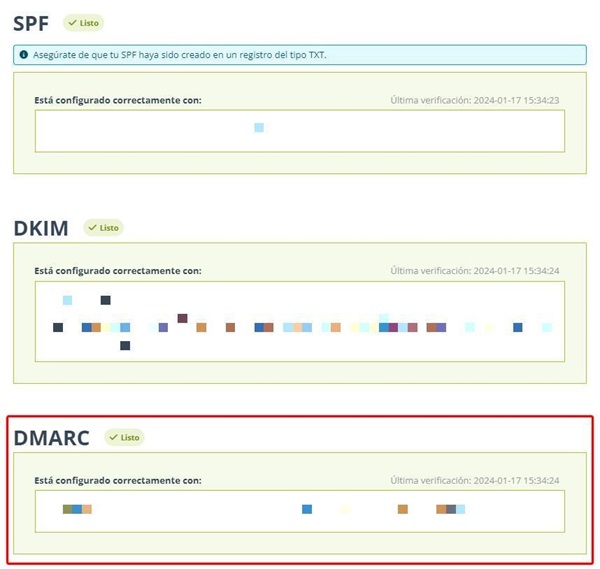 Hazlo de nuevo (el DKIM y SPF se mostrarán en verde, listos) y sigue las instrucciones para el DMARC.